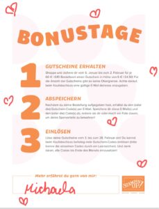 Dann wenn du Angemeldest bist im meinem Online-Shop erhälst du ab 25€  =10% auf deine ganze Bestellung, was du zwar erst Später einlösen kannst. Vielleicht nimmst du es dazu im Februar wo du die Gutscheine einlösen darfst.